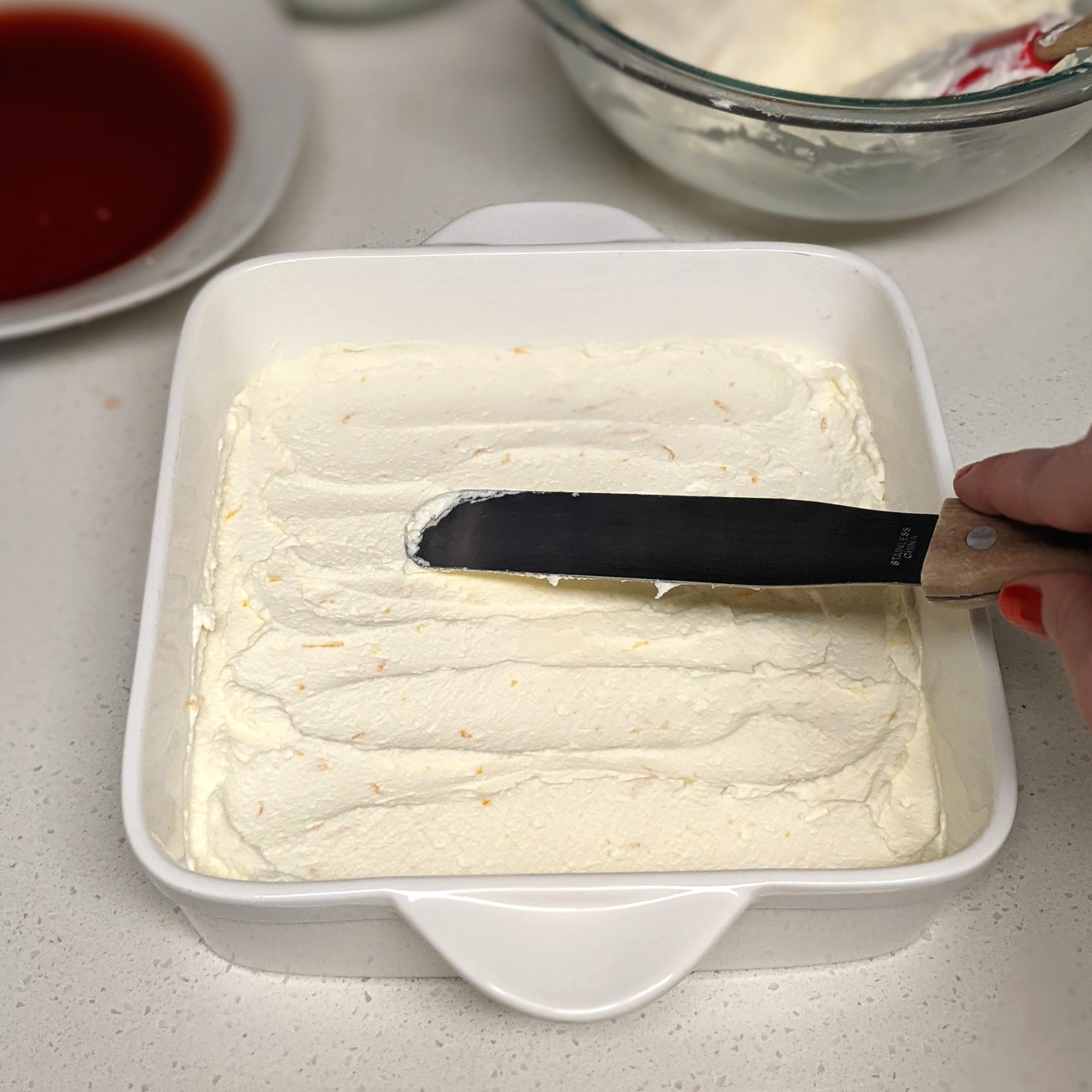 Scoop about a third of the mascarpone mixture on top of the ladyfingers and spread it out evenly with a frosting spatula or butterknife.